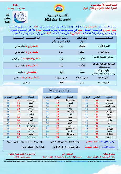 قالت الهيئة العامة للأرصاد الجوية، إنه متوقع لحالة الطقس اليوم الخميس الموافق 21 أبريل، أن يسود طقس ربيعي معتدل الحرارة خلال فترات النهار على القاهرة الكبرى والوجه البحري، لطيف على السواحل الشمالية، مائل للحرارة على شمال الصعيد، بينما ما تزال الأجواء شديدة الحرارة نهارًا على جنوب سيناء وجنوب البلاد.