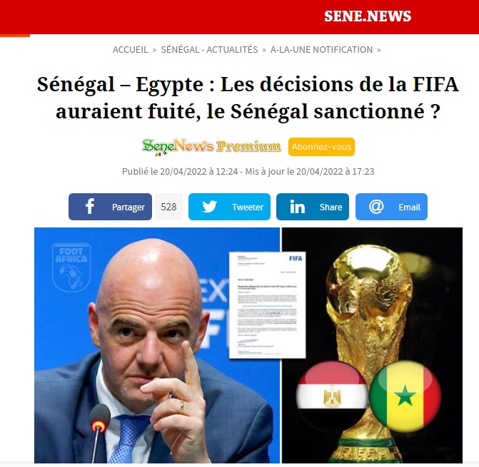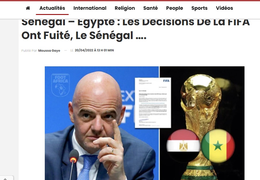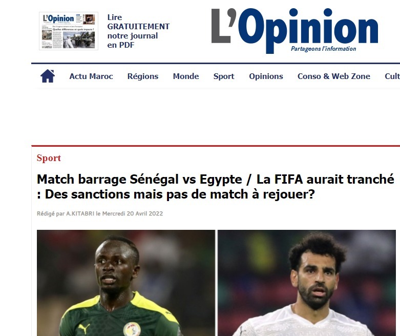أوضحت صحيفة lopinion أنه لا يوجد صحة بشأن إمكانية إقرار الفيفا لمسألة إعادة مباراة منتخب مصر والسنغال بسبب الأحداث الأخيرة، والتي سوف تكون أقصاها غرامة مالية حسب المؤشرات التي وصلت مؤخرًا إلى الاتحاد السنغالي لكرة القدم.