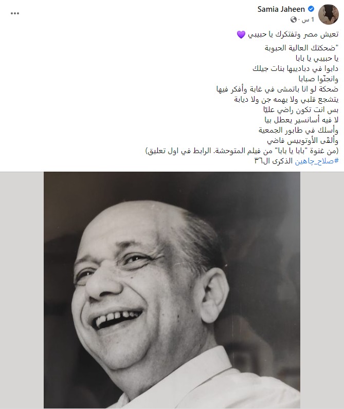 أحيت سامية جاهين ابنة الكاتب الكبير صلاح جاهين، ذكرى وفاته التي توافق اليوم 21 إبريل، معربةً عن حزنها الكبير على رحيله وافتقادها الشديد له، مطالبة الجميع بالدعاء له بالرحمة والمغفرة، ولأسرته بالصبر والسلوان.