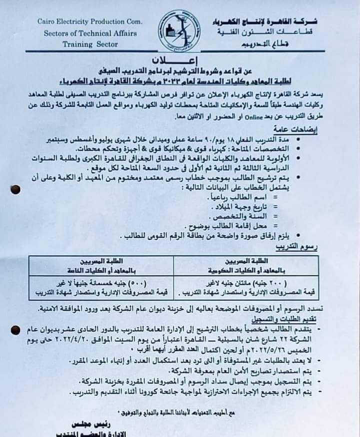 شركة القاهرة لإنتاج الكهرباء تفتح باب الاشتراك لتدريب طلاب هندسة بعد دفع 500 جنيه