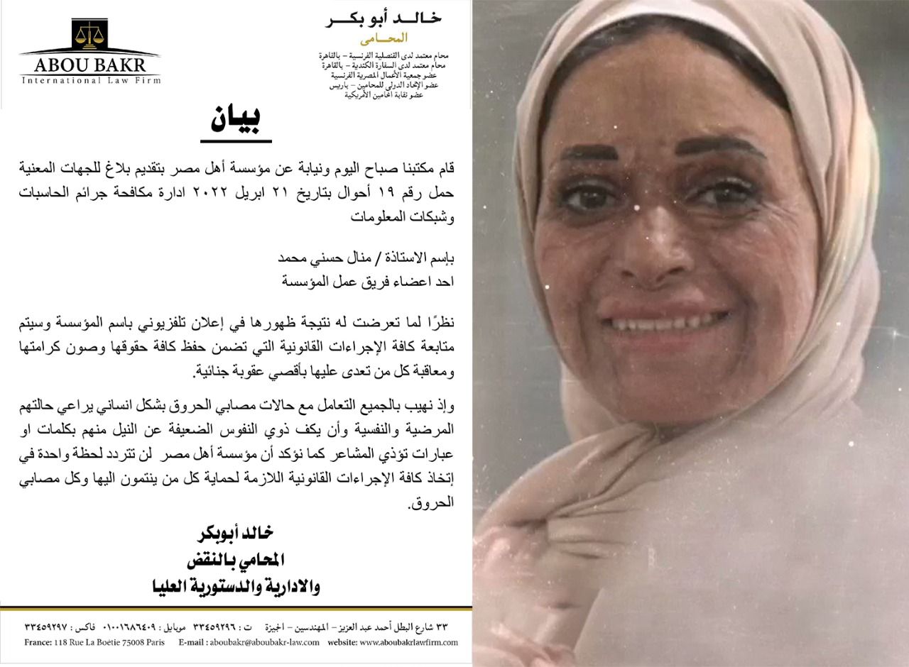 وذكر البلاغ الذي حمل رقم 19 أحوال لسنة 2022، أنه بتاريخ 19 أبريل لسنة 2022، تم عرض إعلان ترويجي لمستشفى أهل مصر لعلاج الحروق بالمجان كانت بطلته منال حسني المتحدثة باسم مؤسسة أهل مصر وإحدى الناجيات من حادث حريق بشع تعرضت له في سن السادس عشر من عمرها وفقدت فيه والدتها واثنين من أفراد عائلتها، وأجريت لها 37 عملية جراحية لمحاولة إزالة إثار الحادث البشع الذي تعرضت لع وتحملت آلاما وأوجاعا نفسية وبدنية.