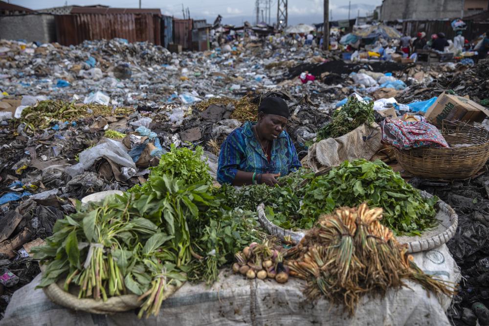 أما في مدينة بورت أو برنس عاصمة دولة هايتي، تبيع هذه السيدة الخضار أمام حقل من القمامة المتحللة، بعضها يحترق في أكوام.