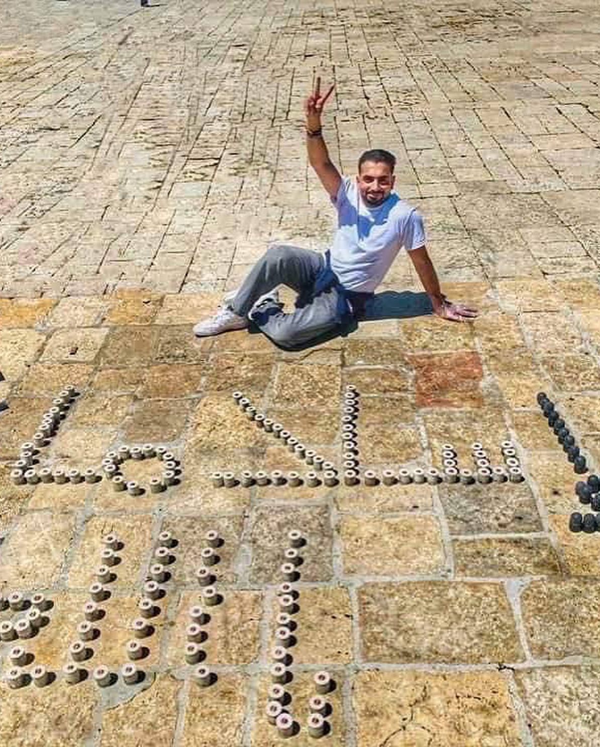 وأضاف عبد الله، الصورة الثانية كانت بعدما لميت فيها جميع الطلقات المطاط والقنابل المسيلة للدموع اللي اضربت علينا في الأقصى، حيث أنه وفي صورة أخرى استخدم الطلقات المطاط والقنابل المسيلة في كتابة بعض الكلمات على الأرض.