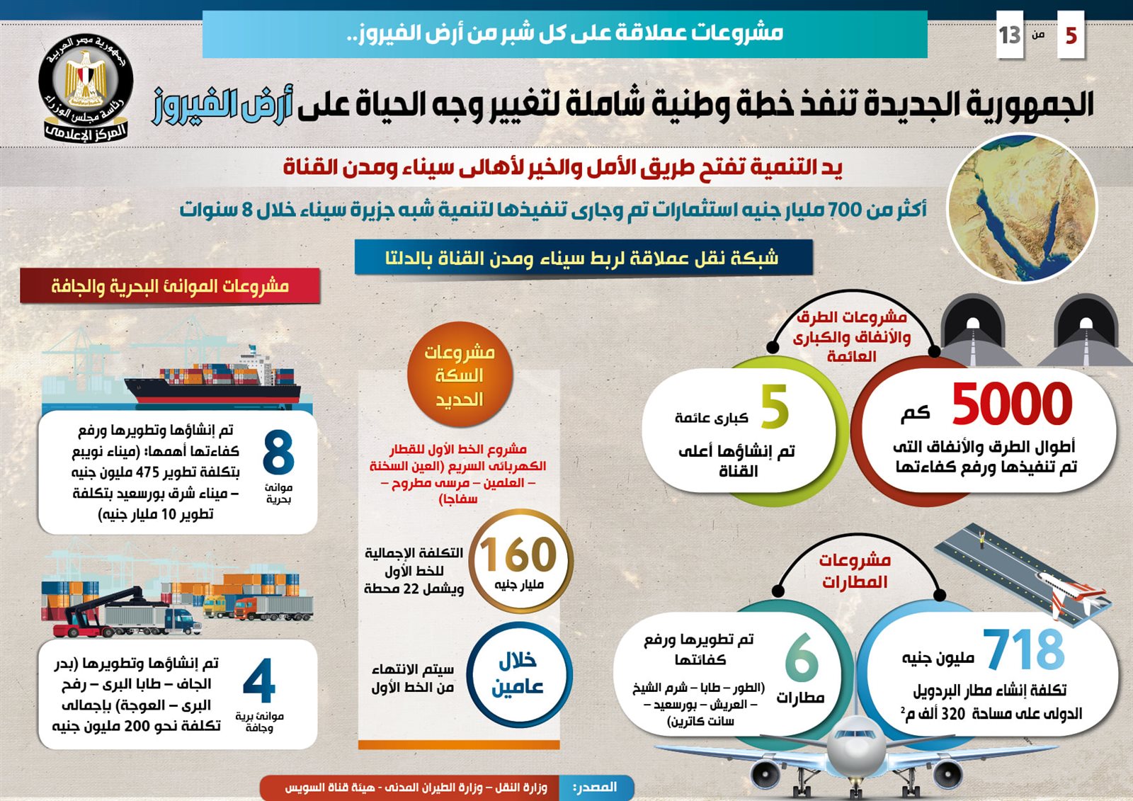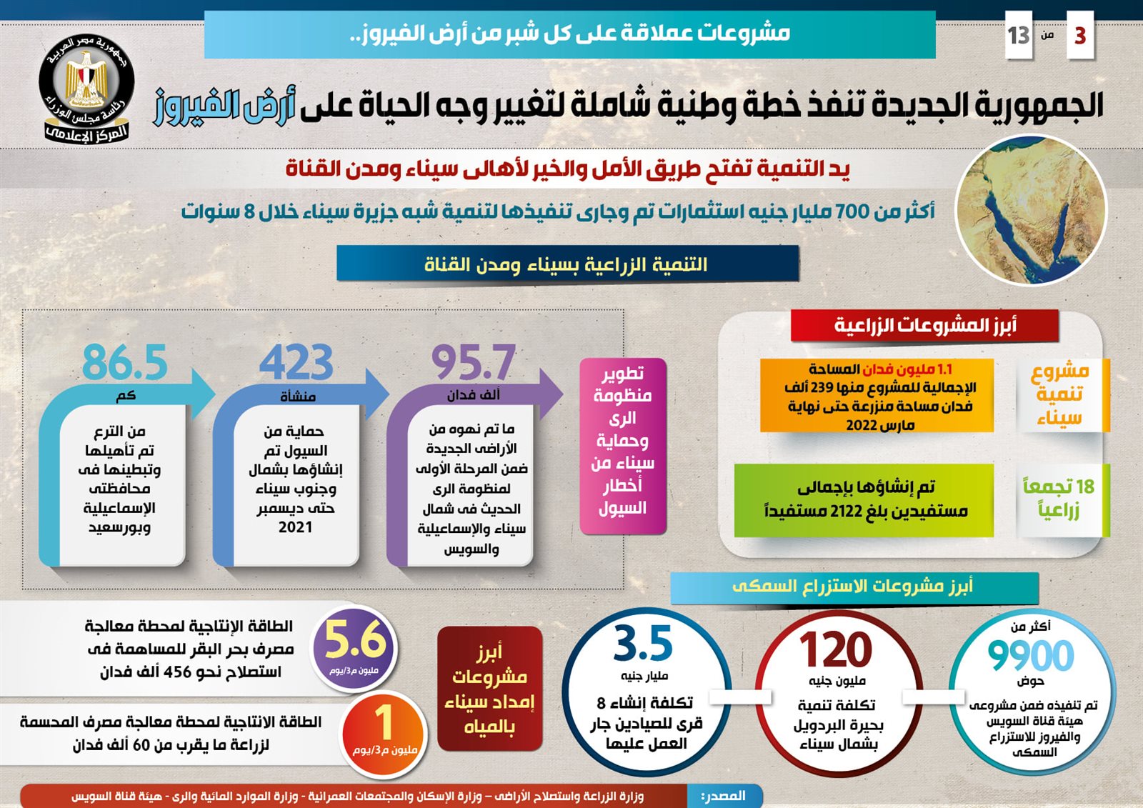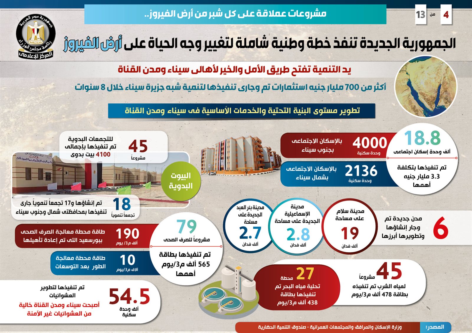نشر المركز الإعلامي لمجلس الوزراء، تقريرًا تضمن إنفوجرافات تسلط الضوء على الخطة الوطنية والشاملة للجمهورية الجديدة؛ من أجل تغيير وجه الحياة على أرض الفيروز من خلال إطلاق مشروعات عملاقة على كل شبر منها، باستثمارات تبلغ أكثر من 700 مليار جنيه تم وجار تنفيذها لتنمية سيناء خلال 8 سنوات.