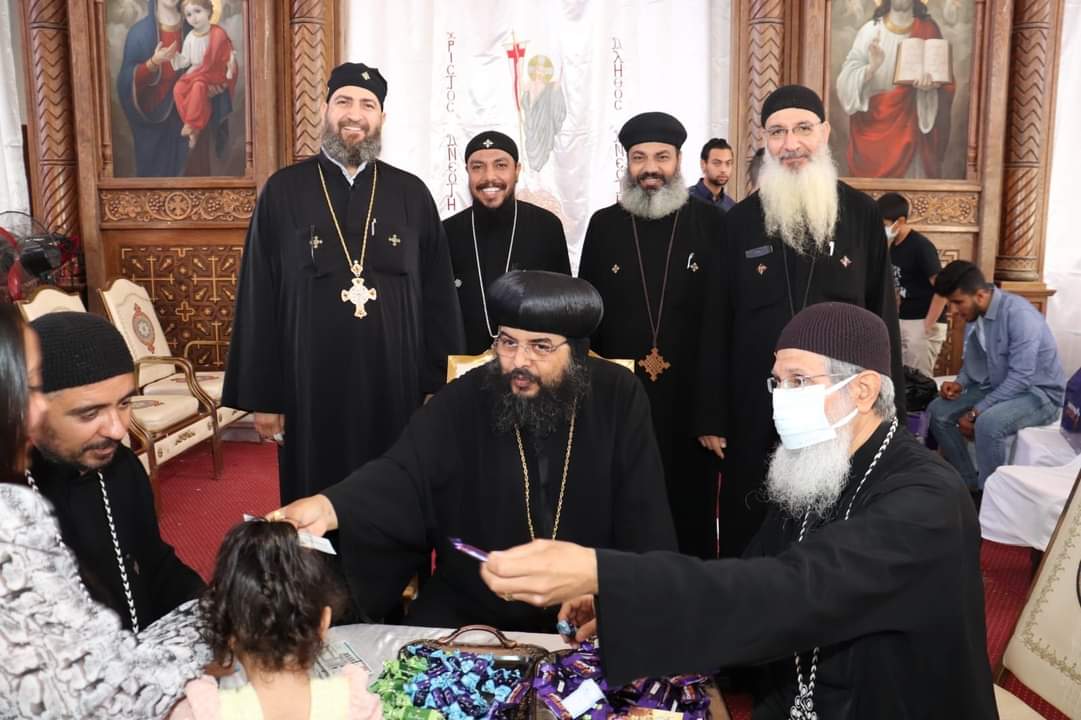 وزع الأنبا ايلاريون أسقف البحر الأحمر، الحلوى والشوكولاتة على الشباب والأطفال والرجال والنساء، عقب توافدهم لتقديم التهنئة بعيد القيامة المجيد؛ ونيل البركة والدعوات.