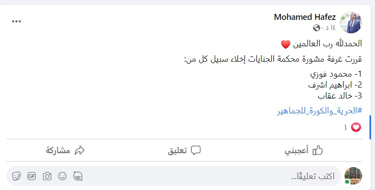 وأوضح المحامي الحقوقي، أن غرفة مشورة محكمة الجنايات، قررت إخلاء سبيل كلا من: محمود فوزي، إبراهيم اشرف، خالد عقاب.