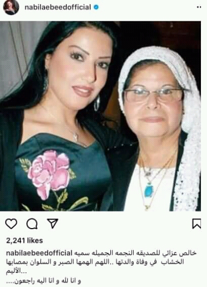 ونعت الفنانة نبيلة عبيد، سمية الخشاب في وفاة والدتها، وذلك عبر حسابها الشخصي انستجرام، وكتبت: خالص عزائي للصديقة الجميلة سمية الخشاب في وفاة والدتها، اللهم ألهمها الصبر والسلوان بمصابها الأليم، وإنا لله وإنا إليه راجعون.