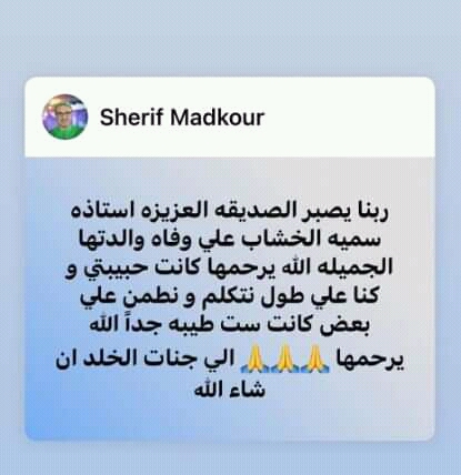 وكتبت سمية الخشاب، منشورًا عبر حسابها الشخصي بموقع التغريدات القصيرة تويتر: إنا لله وأنا إليه راجعون توفيت إلى رحمه الله والدتي الغالية الله يرحمها ويغفر لها ويسكنها فسيح جناته نسألكم الدعاء.