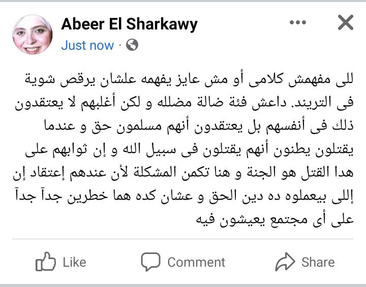 وكتبت عبير الشرقاوي عبر حسابها الشخصي بموقع فيس بوك: اللي مفهمش كلامي أو مش عايز يفهمه عشان يرقص شوية في التريند، داعش فئة ضالة مضلله ولكن أغلبهم لا يعتقدون ذلك في أنفسهم، بل يعتقدون أنهم مسلمون حق.