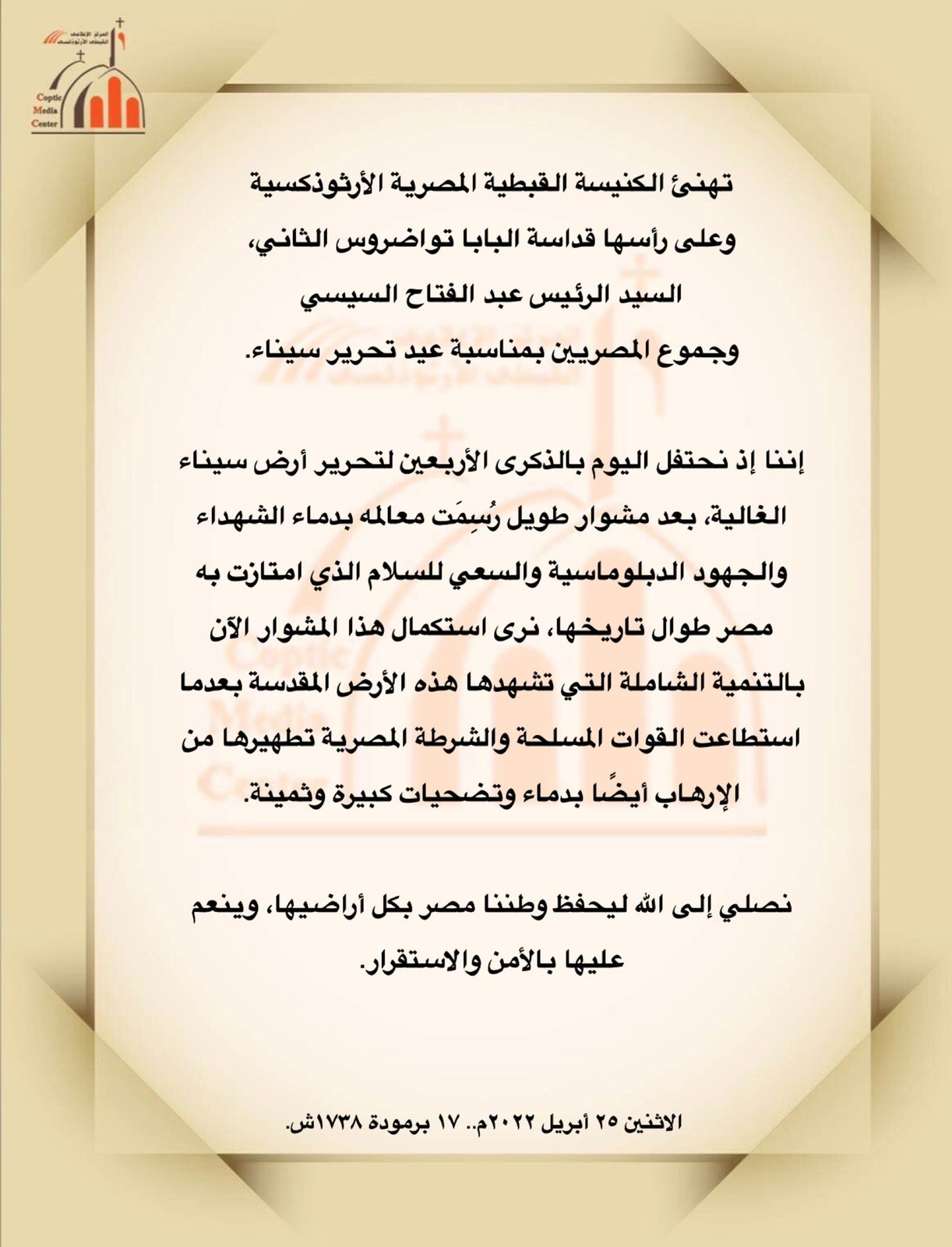 وجاء في نص التهنئة: نحتفل اليوم بالذكرى الأربعين لتحرير أرض سيناء الغالية، بعد مشوار طويل رُسِمَت معالمه بدماء الشهداء والجهود الدبلوماسية والسعي للسلام؛ الذي امتازت به مصر طوال تاريخها، نرى استكمال هذا المشوار الآن بالتنمية الشاملة التي تشهدها هذه الأرض المقدسة، بعدما استطاعت القوات المسلحة والشرطة المصرية تطهيرها من الإرهاب أيضًا بدماء وتضحيات كبيرة وثمينة.