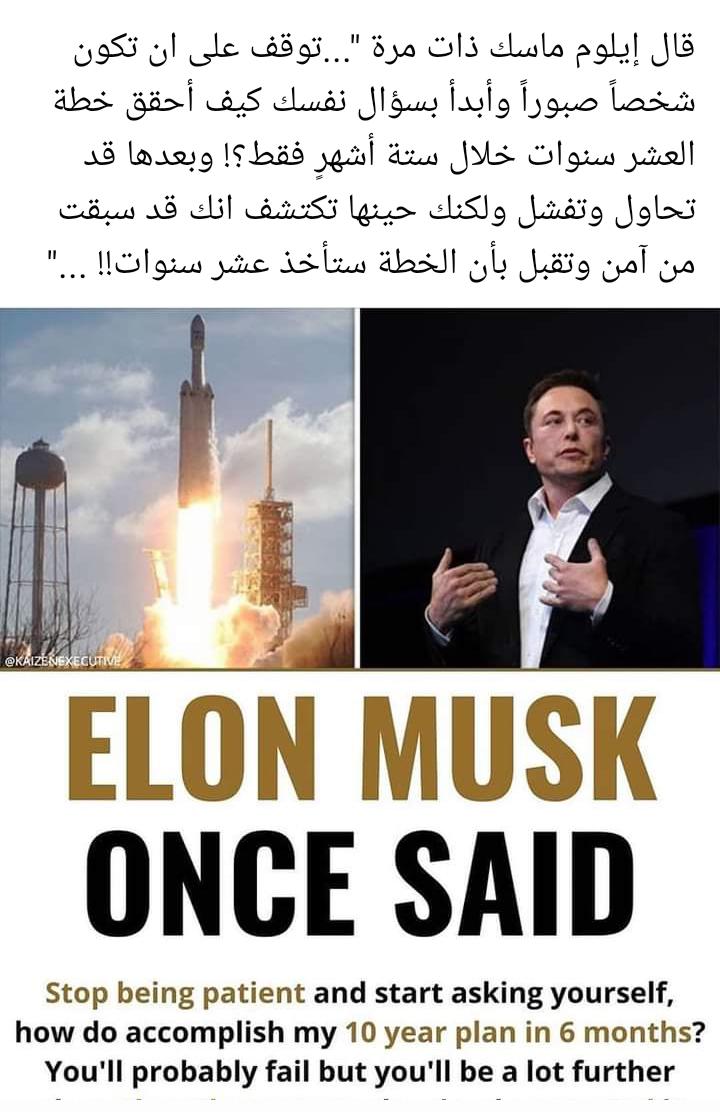 وقال آخر عبر فيسبوك: قال إيلون ماسك ذات مرة "توقف على أن تكون شخصًا صبورًا وأبدأ بسؤال نفسك كيف أحقق خطة العشر سنوات خلال ستة أشهرٍ فقط؟! وبعدها قد تحاول وتفشل ولكنك حينها تكتشف انك قد سبقت من آمن وتقبل بأن الخطة ستأخذ عشر سنوات!!"