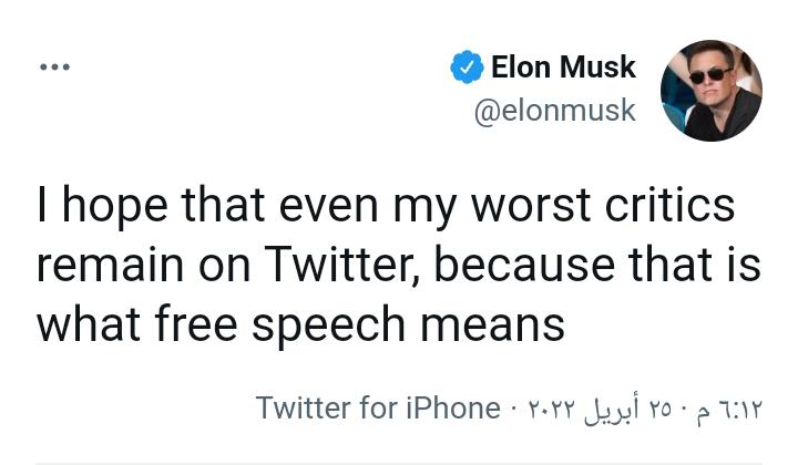 وكتب إيلون ماسك في تغريدة عبر حسابه الخاص تويتر: آمل أن يظل حتى أسوأ منتقدي على تويتر، لأن هذا هو ما تعنيه حرية التعبير، ذلك بعد إعلانه بامتلاك تويتر.