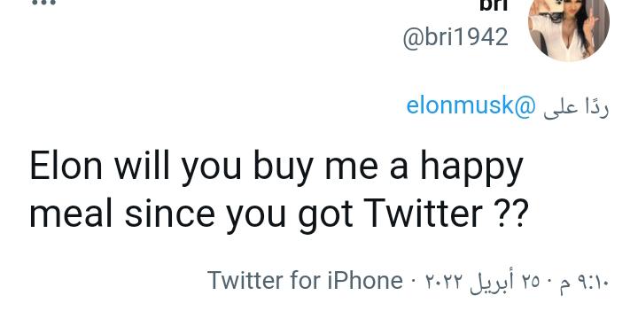 وعلقت أحدهم بسخرية: إيلون هل ستشتري لي وجبة سعيدة مثلما حظيت على تويتر؟