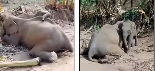 ورفض الفيل الرضيع ترك جثة والدته وكما تظهر لقطات الفيديو فأن الفيل الرضيع يرقد بجانب والدته في حالة من الحزن.