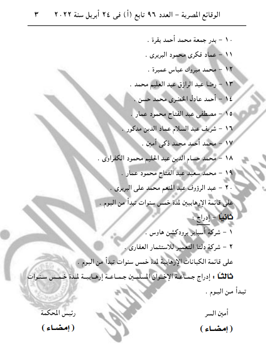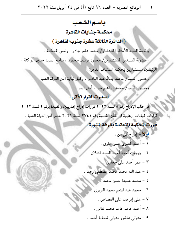 وذلك على بعد الاطلاع على طلب الإدراج رقم 5 لسنة 2022، قرارات إدراج إرهابيين والمقيدة برقم 2 لسنة 2022، وقرارات كيانات إرهابية في شأن القضية رقم 2741 لسنة 2021 حصر أمن الدولة العليا.