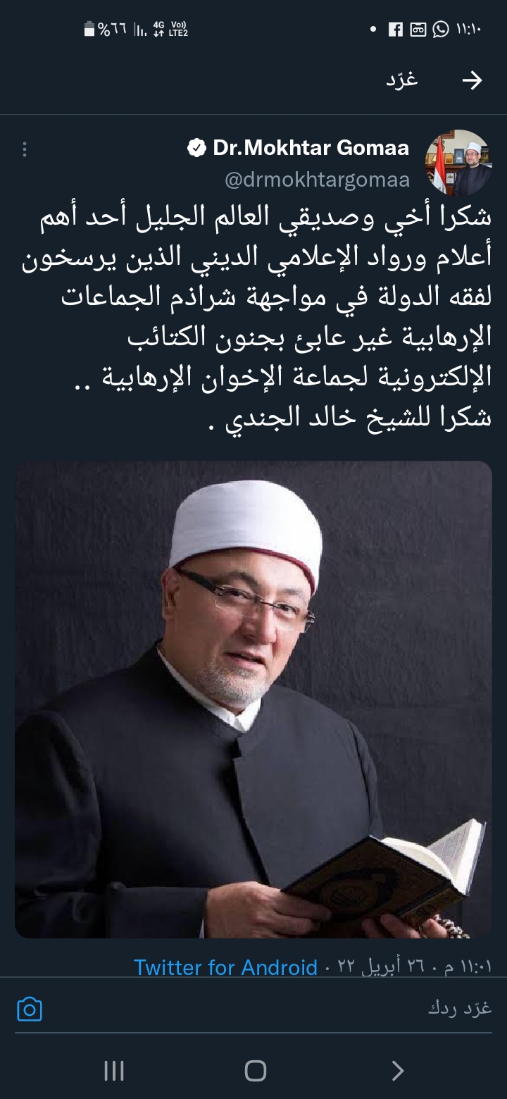وكتب وزير الأوقاف، تغريدة له عبر حسابه الرسمي بموقع التدوينات القصيرة تويتر، قال فيها: شكرا أخي وصديقي العالم الجليل أحد أهم أعلام ورواد الإعلام الديني الذين يرسخون لفقه الدولة في مواجهة شراذم الجماعات الإرهابية غير عابئ بجنون الكتائب الإلكترونية لجماعة الإخوان الإرهابية.. شكرا للشيخ خالد الجندي.