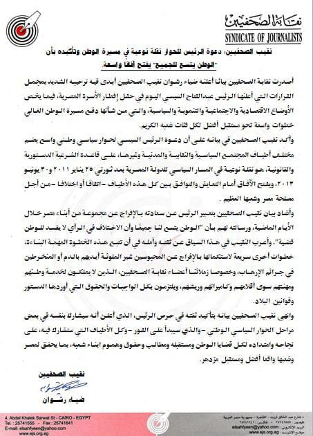 وأشاد بيان نقيب الصحفيين بتعبير الرئيس عن سعادته بالإفراج عن مجموعة من أبناء مصر خلال الأيام الماضية، ورسالته لهم بأن "الوطن يتسع لنا جميعًا وأن الاختلاف في الرأي لا يفسد للوطن قضية".