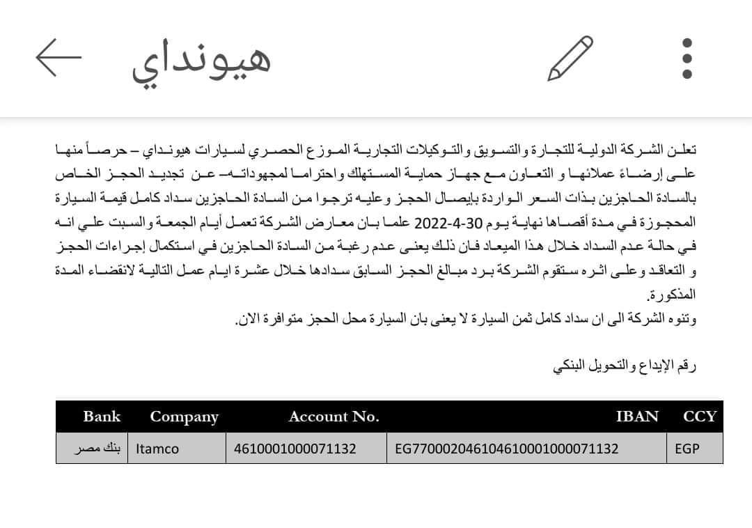 كما أشار أنه بعض الحاجزين واجههوا مشكلات من هذا النوع مع الوكيل وسيتجهوا جميعهم إلى جهاز حماية المستهلك لتحرير شكوى ضد وكيل هيونداي في مصر بهدف الاستلام بالسعر القديم. منوهًا على ضرورة استرداد فرق السعر الذي أجبروه على دفعه بحجة الاستلام في مهلة قصيرة وقيمته 40 ألف جنيه.