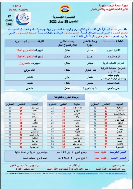 أما عن توقعات هيئة الأرصاد لحالة الطقس مساء غدا الخميس، أشارت في نشرتها الجوية إلى أنه يسود طقس معتدل الحرارة على أنحاء مصر كافة، حيث تتراوح درجات الحرارة الصغرى ما بين 20 إلى 25 درجة مئوية ليلًا.