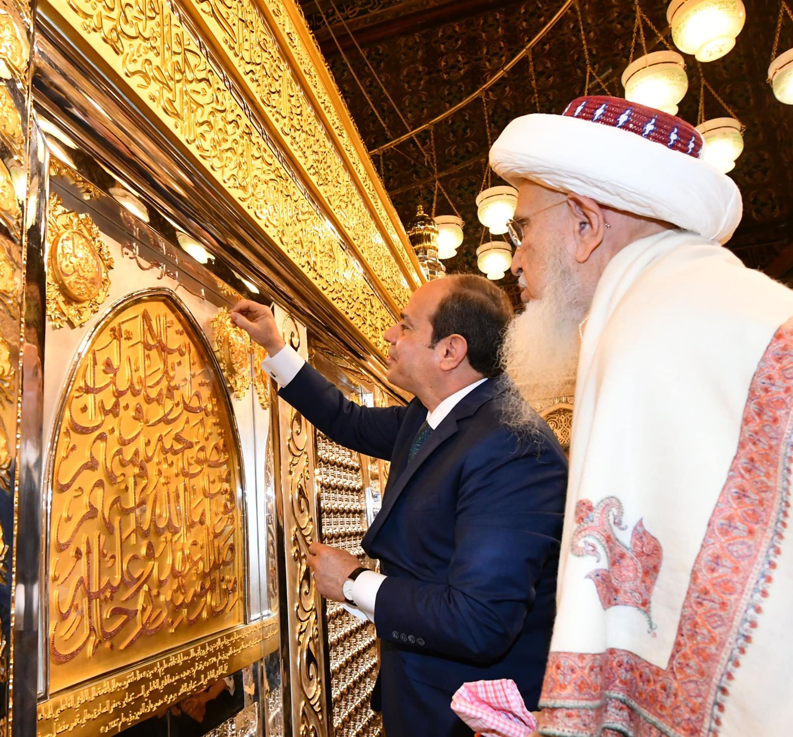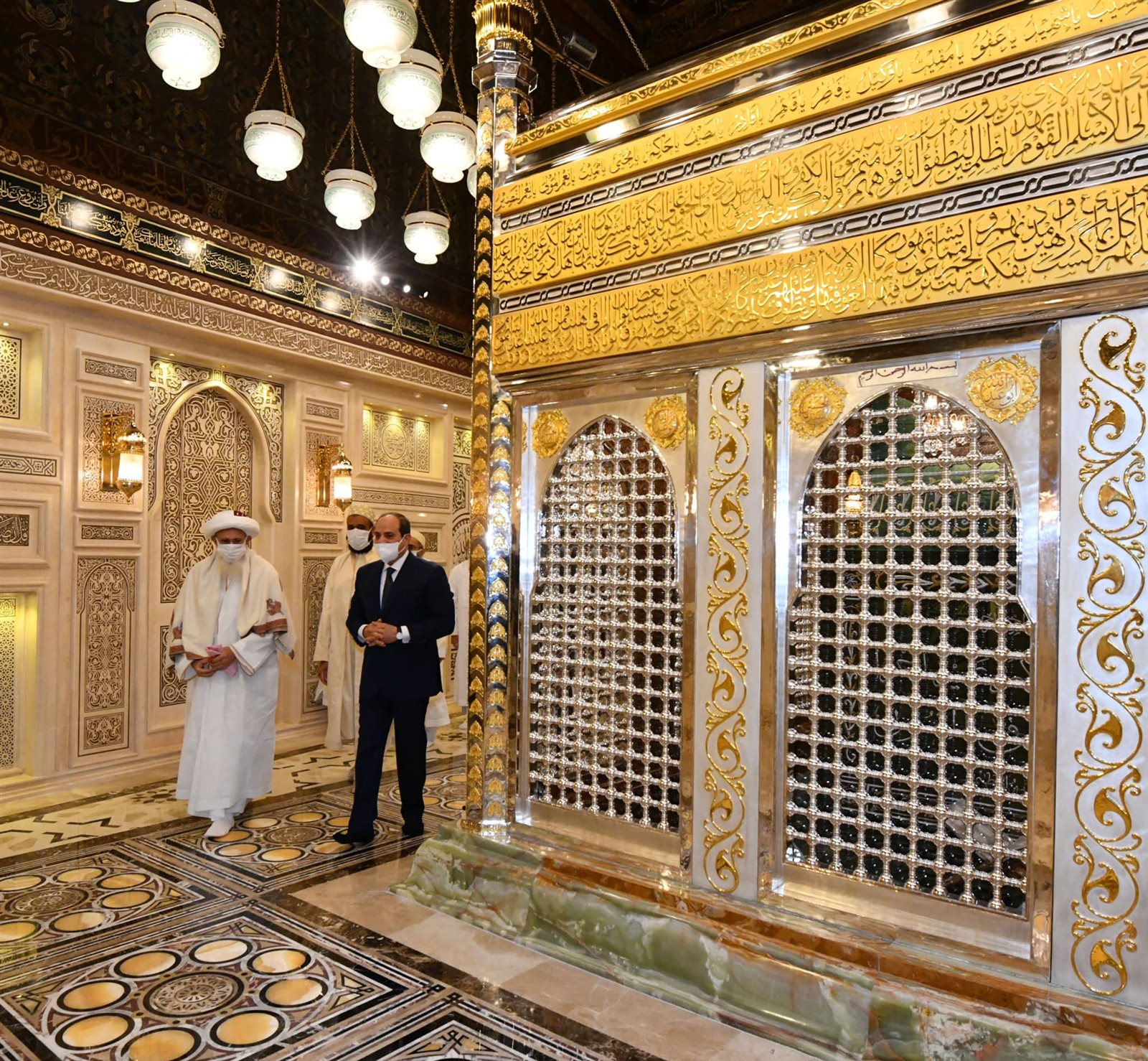 افتتح الرئيس عبد الفتاح السيسي، رئيس الجمهورية، صباح اليوم، مسجد الحسين بعد أعمال التجديد الشاملة للمسجد بما في ذلك المقصورة الجديدة للضريح الشريف للإمام الحسين.