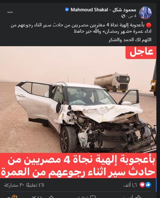 وقال محمود شكل منسق عام نقابة العاملين بالخارج، في منشور له على موقع التواصل الاجتماعي فيس بوك، إن أربعة مصريين نجوا بأعجوبة إلهية من حادث سـير أثناء رجوعهم من أداء عمـرة شـهر رمضـان.