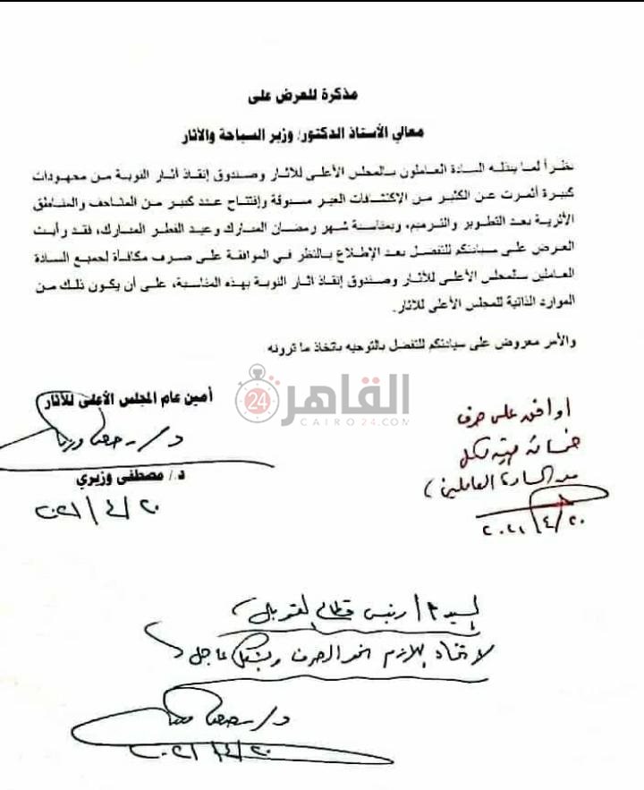 وافق الدكتور خالد العناني وزير السياحة والآثار، على مذكرة الدكتور مصطفي وزيري الأمين العام للمجلس الأعلى للآثار، والذي طلب فيها صرف مكافأة للعاملين بالمجلس الأعلى للآثار وصندوق إنقاذ آثار النوبة.