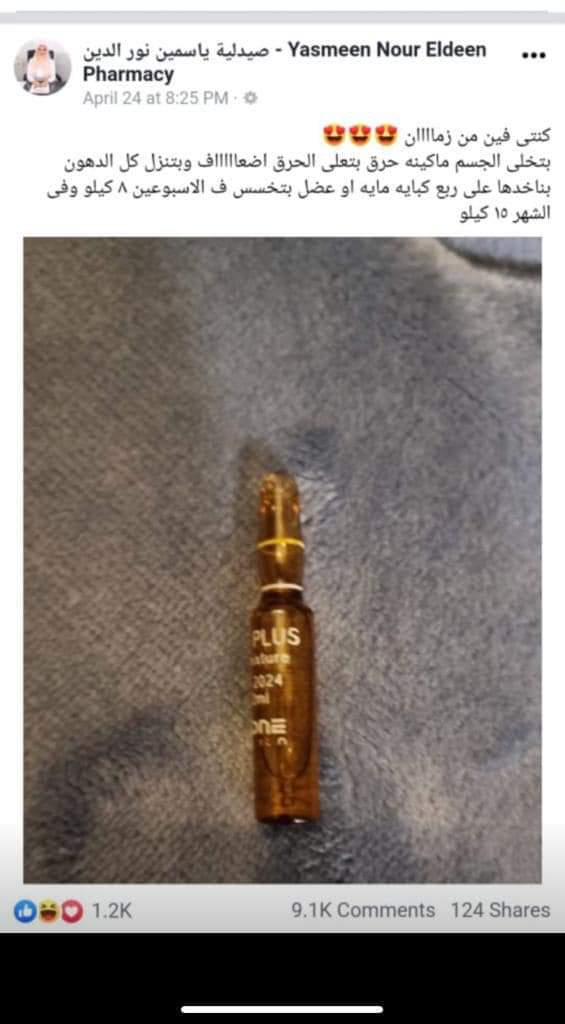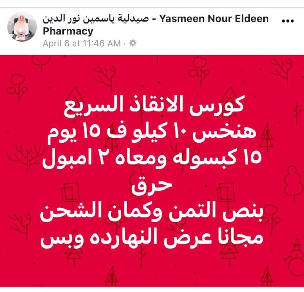 نشرت صفحة خاصة بإحدى الصيدليات إعلانًا عن كبسولة تساعد على خسارة الوزن بشكل سريع للغاية، مما أثار جدلًا واسعًا لرواد مواقع التواصل الاجتماعي، وكتبت الصيدلية: كورس الإنقاذ السريع، هنخس 10 كيلو في 15 يوما، 15 كبسولة ومعاه 2 امبول حرق، بنص التمن، وكمان الشحن مجانًا، عرض النهارده بس.