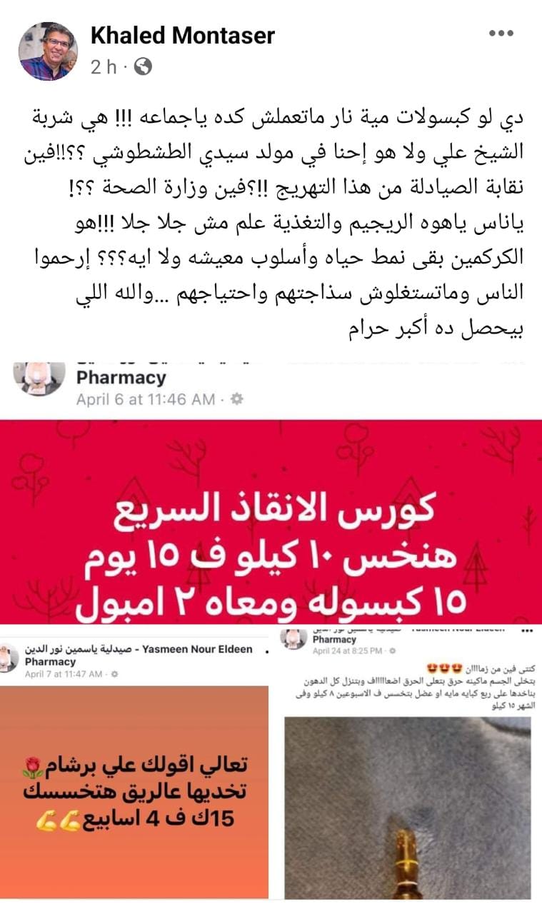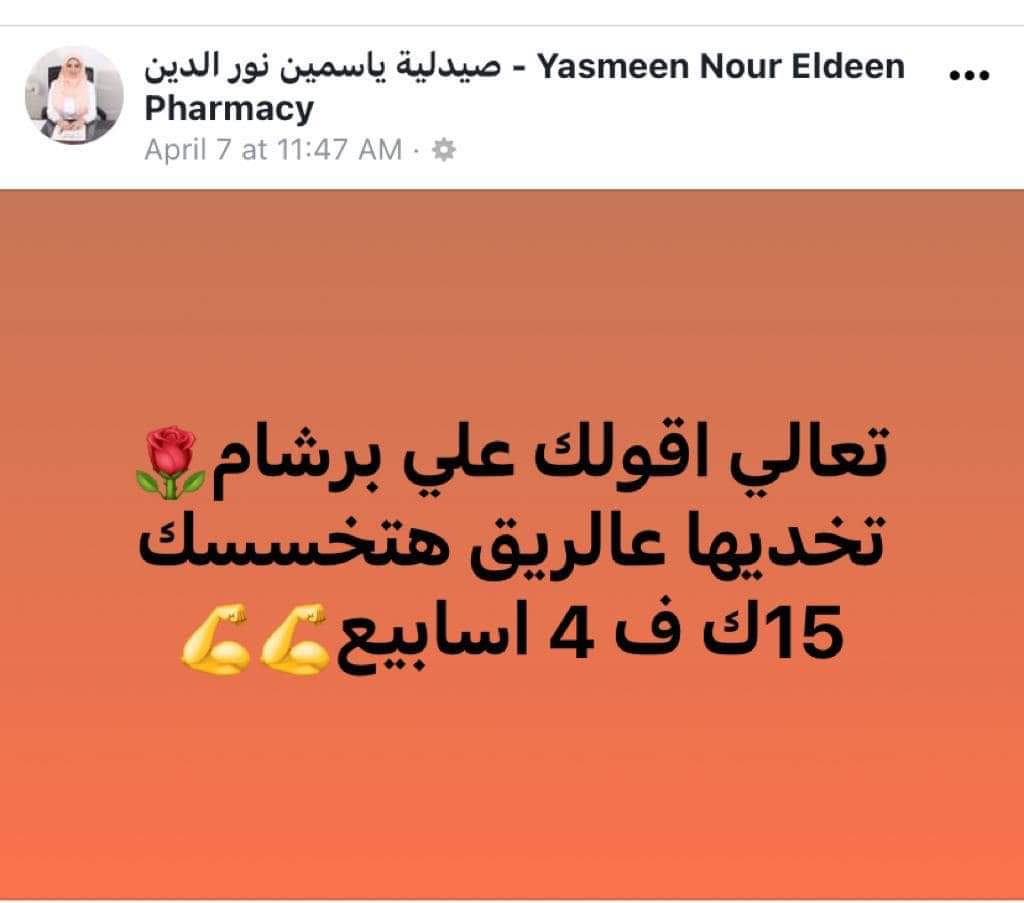 وتابعت الصيدلية في منشور آخر: تعالى أقولك على برشام تخديها على الريق هتخسسك 15 كيلو في 4 أسابيع، فيما نشرت منشورا آخر معلقة: كنتي فين من زمان، بتخلي الجسم ماكينة حرق بتعلي لحرق أضعاف وبتنزل كل الدهون، بناخدها على ربع كباية مية، أو عضل بتخسس في الأسبوعين 8 كيلو وفي الشهر 15 كيلو.