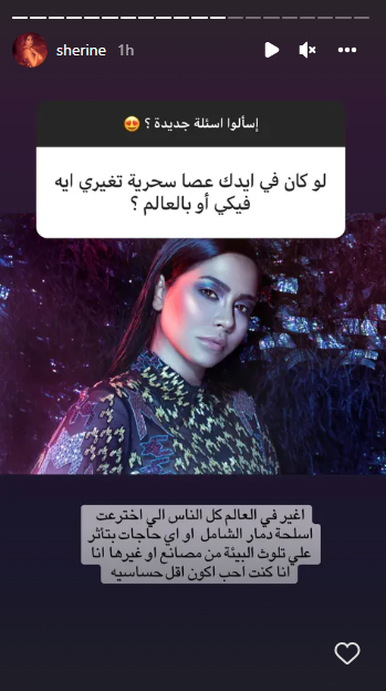 وأكدت شيرين أنها لو امتلكت عصا سحرية لغيرت أسلحة الدمار الشامل أو أي شيء يؤثر على تلوث البيئة من مصانع وغيرها، وكذلك كانت ستغير من نفسها لتكون أقل حساسية.