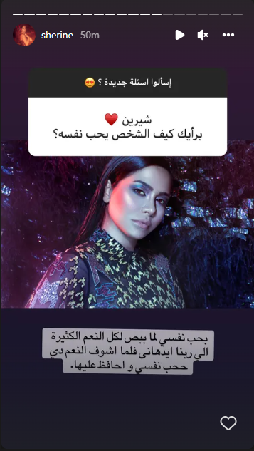 وعن رأيها كيف للشخص أن يحب نفسه، قالت: بحب نفسي لما أبص لكل النعم الكثيرة اللي ربنا أدهالي فلما أشوف النعم دي هحب نفسي وأحافظ عليها.