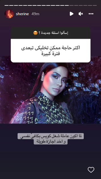 وردًا على سؤال ما أكثر شيء يمكن أن يجعلها تبتعد لفترة كبيرة، قالت شرين: لما أكون عاملة شغل كويس بكافئ نفسي وأخد إجازة طويلة.