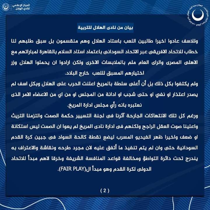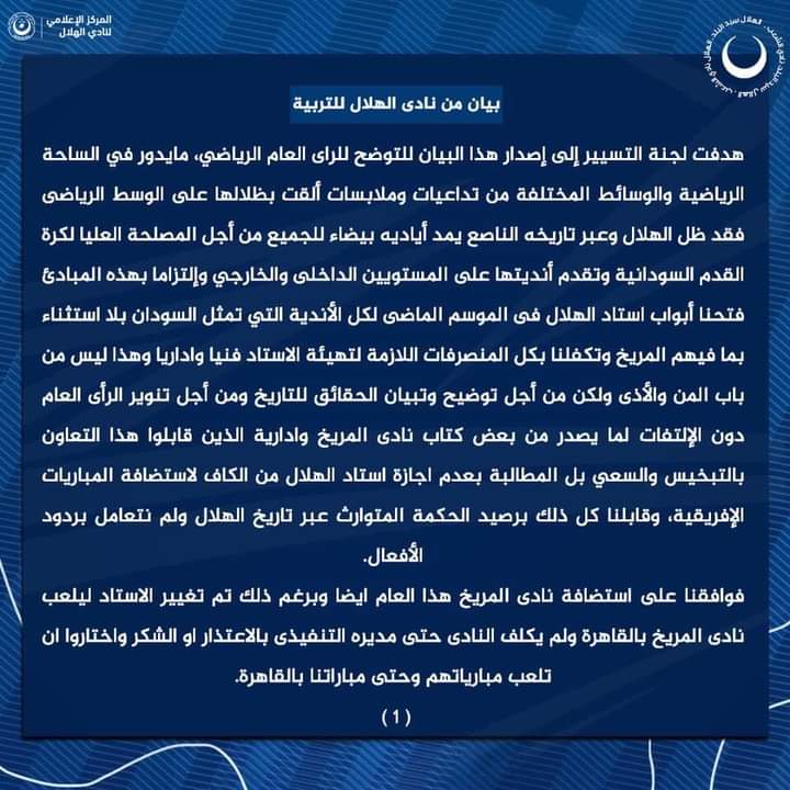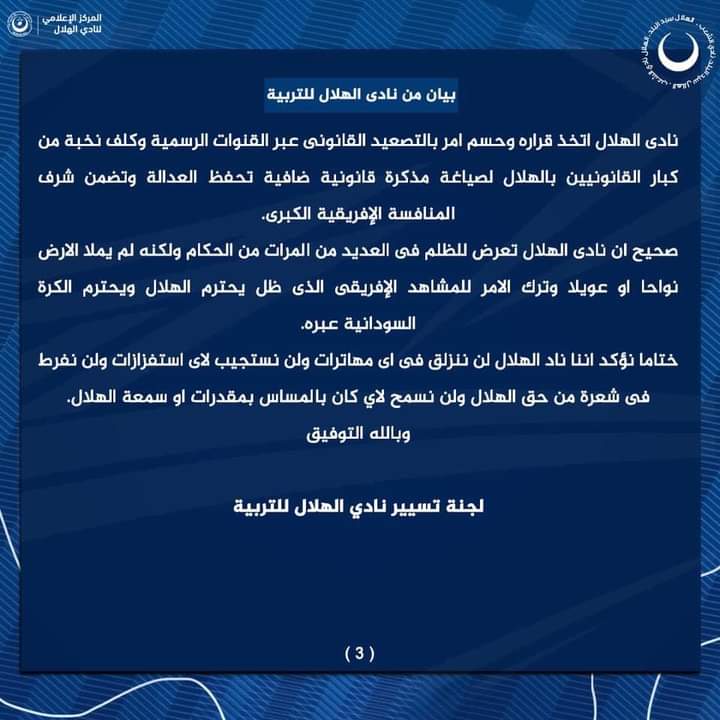 أعلن نادي الهلال السوداني، عن اللجوء للطرق القانونية، وذلك ردا على التسريبات التي خرجت من نائب رئيس المريخ بوجود اتفاق مع النادي الأهلي المصري بالتلاعب بنتيجة المباراة بينهما في دوري أبطال إفريقيا.