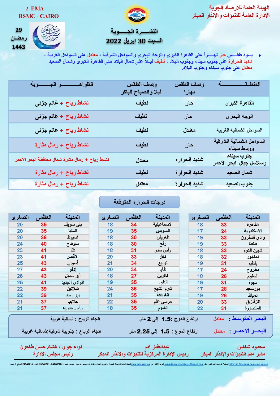 تتوقع الهيئة العامة للأرصاد الجوية أن يسود اليوم السبت الموافق 30 أبريل طقس حار نهارًا على القاهرة الكبرى والوجه البحري والسواحل الشرقية، معتدل على السواحل الغربية، وما زالت الأجواء شديدة الحرارة على محافظات شمال وجنوب الصعيد وجنوب سيناء وسلاسل جبال البحر الأحمر.