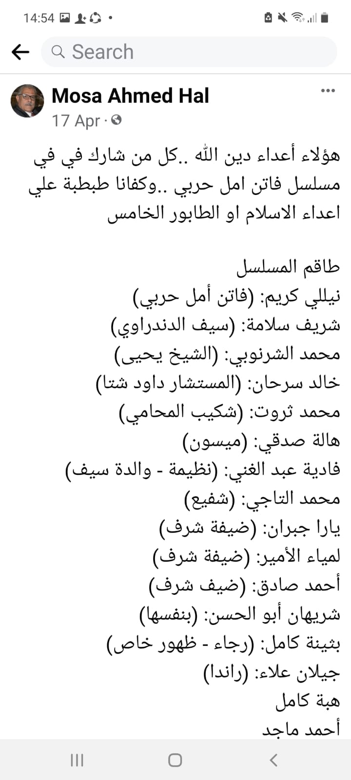 وانتقد أحد الصحفيين عبر حسابه الشخصي على فيس بوك، مسلسل فاتن أمل حربي وصناعه، قائلًا: هؤلاء أعداء دين الله، كل من شارك في مسلسل فاتن أمل حربي وكفانا طبطبة على أعداء الإسلام أو الطابور الخامس. ذاكرًا أسماء طاقم عمل المسلسل كاملًا، حتى واضعي الموسيقى التصويرية والإخراج.