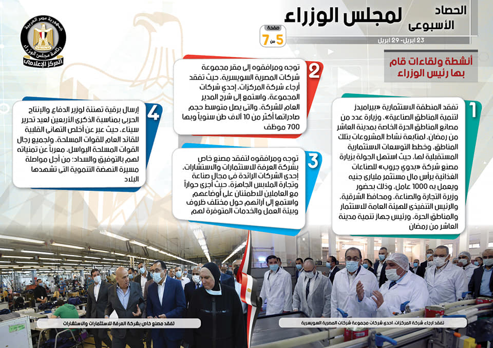 وبشأن الأنشطة التي نفذها رئيس مجلس الوزراء، فبحسب التقرير، شملت تفقد المنطقة الاستثمارية بيراميدز لتنمية المناطق الصناعية، وزيارة عدد من مصانع المناطق الحرة الخاصة بمدينة العاشر من رمضان، لمتابعة نشاط المشروعات بتلك المناطق، وخطط التوسعات الاستثمارية المستقبلية لها، حيث استهل الجولة بزيارة مصنع شركة بدوي جروب للصناعات الغذائية برأس مال مستثمر ملياري جنيه ويعمل به 1000 عامل، وذلك بحضور وزيرة التجارة والصناعة، ومحافظ الشرقية، والرئيس التنفيذي للهيئة العامة للاستثمار والمناطق الحرة، ورئيس جهاز تنمية مدينة العاشر من رمضان، بالإضافة إلى توجه سيادته ومرافقوه إلى مقر مجموعة شركات المصرية السويسرية، حيث تفقد أرجاء شركة المركزات، إحدى شركات المجموعة، واستمع إلى شرح المدير العام للشركة، والتي يصل متوسط حجم صادراتها أكثر من 10 آلاف طن سنويًا وبها 700 موظف، بجانب توجه سيادته ومرافقوه لتفقد مصنع خاص بشركة العرفة للاستثمارات والاستشارات، إحدى الشركات الرائدة في مجال صناعة وتجارة الملابس الجاهزة، حيث أجرى حوارًا مع العاملين للاطمئنان على أوضاعهم واستمع إلى آرائهم حول مختلف ظروف وبيئة العمل والخدمات المتوفرة لهم.