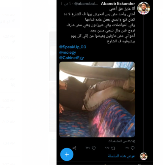 نشر شاب يدعى أبنوب إسكندر مقطع فيديو عبر موقع التواصل الاجتماعي تويتر، يوثق فيه مجموعة من الصور والفيديوهات لشاب أقدم على التحرش بشقيقته، بعد ممارسته فعل فاضح، حيث حاول ممارسة العادة السرية أمام الفتاة، داخل الميكروباص في منطقة شيراتون بمصر الجديدة.