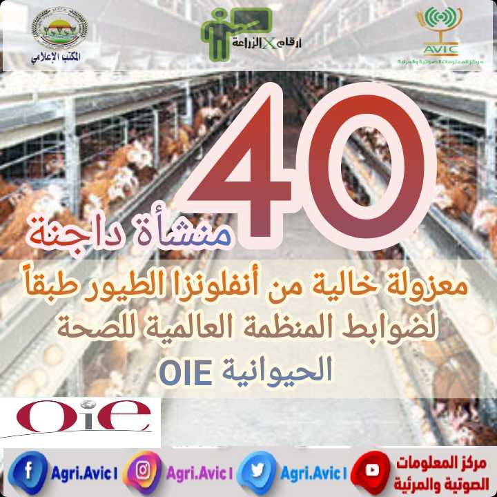 وأعلنت المنظمة العالمية للصحة الحيواني، oIE، موافقتها على تسجيل مصر رسميا ضمن قائمة الدول التى تعتمد نظام المنشآت الخالية من مرض إنفلونزا الطيور، حيث تم اعتماد وتسجيل 40 منشأة داجنة معزولة، ضد إنفلونزا الطيور في مصر، مما ساعد في فتح آفاق لتصدير الدواجن ومشتقاتها أمام منتجي هذه الصناعة، بعد توقف منذ عام 2006.