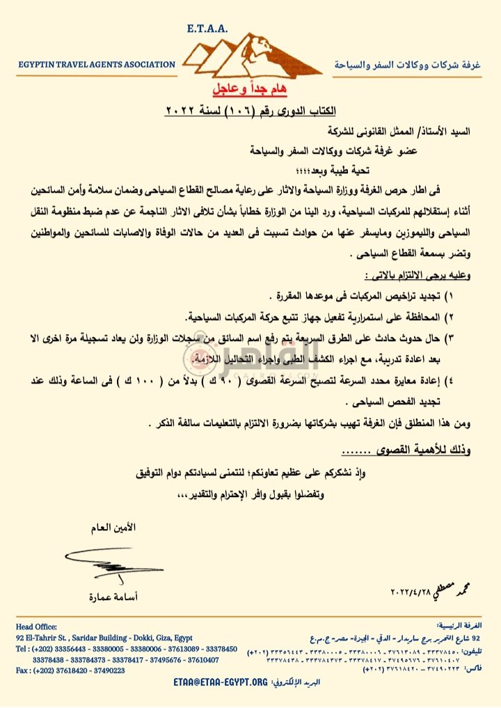 إنه في اطار حرص الغرفة ووزارة السياحة والآثار على رعاية مصالح القطاع السياحي وضمان سلامة وأمن السائحين أثناء استقلالهم للمركبات السياحية، وضعت وزارة السياحة والآثار عدة التزامات، بشأن تلافي الآثار الناجمة عن عدم ضبط منظومة النقل السياحي والليموزين وما يسفر عنها من حوادث تسببت في العديد من حالات الوفاة والإصابات للسائحين والمواطنين وتضر بسمعة القطاع السياحي وعليه يرجي الالتزام بالاتي: