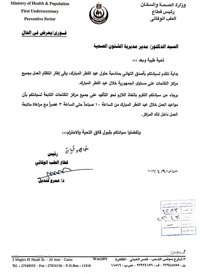 وأكدت وزارة الصحة والسكان، في منشور لها، على إمكانية الحصول على الجرعات الأولى والثانية والتنشيطية من اللقاحات المضادة لـ فيروس كورونا خلال أيام عيد الفطر المبارك.