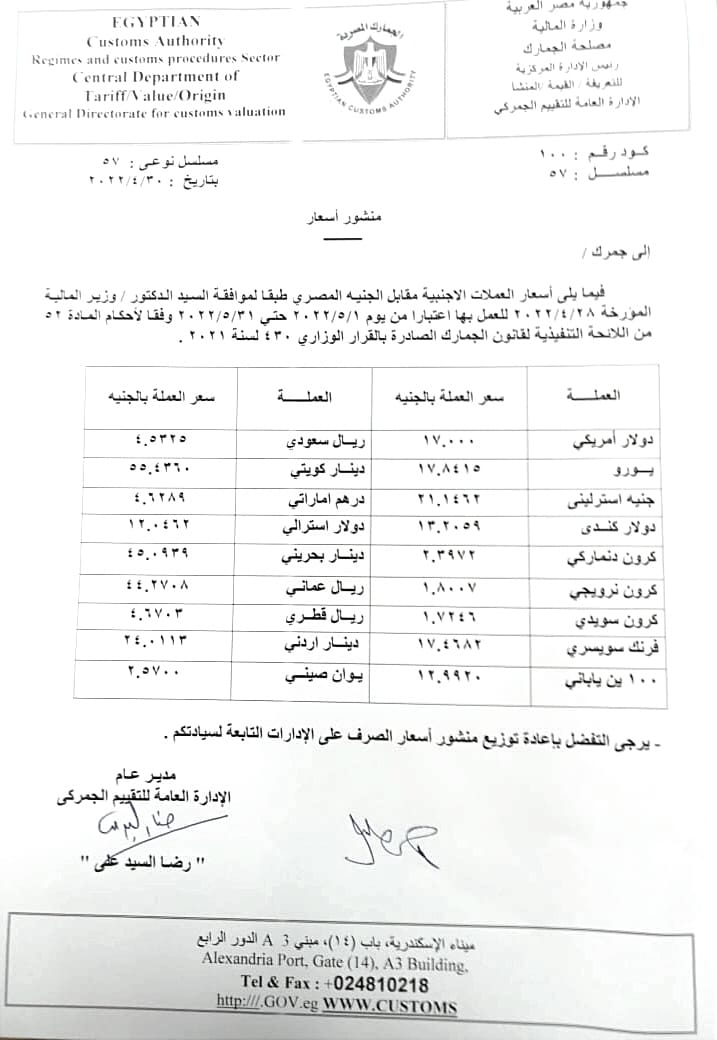 أصدر الدكتور محمد معيط وزير المالية المنشور رقم 57 لسنة 2022 الخاص بأسعار صرف العملات الأجنبية الجديدة والذي سيتم العمل بها من يوم 1 مايو 2022 حتى 31 مايو 2022، وتضمن رفع سعر الدولار الجمركي إلى 17 جنيها بدلا من 16 جنيها.