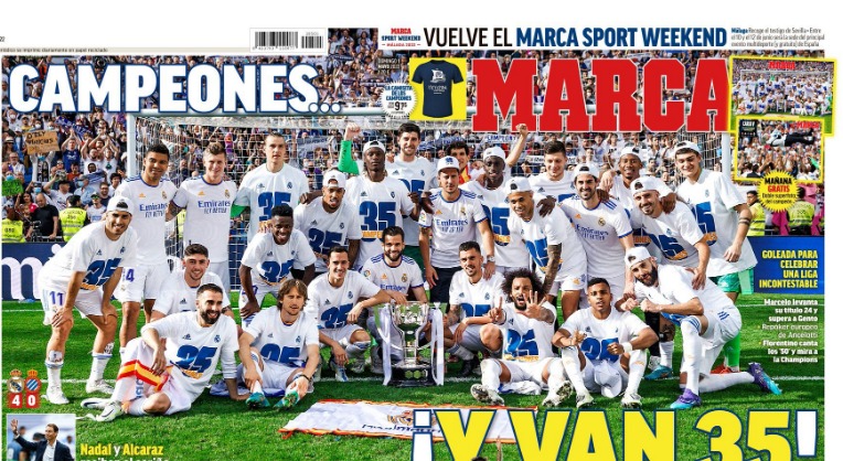 عنونت ماركا في غلافها الصادر عن عدد اليوم، بـ أبطال ونحو الـ35، وقالت إن فلورنتينو بيريز حقق اللقب الـ50 لهُ وينظر إلى الأبطال، مع اللقب الـ 24 لمارسيلو.