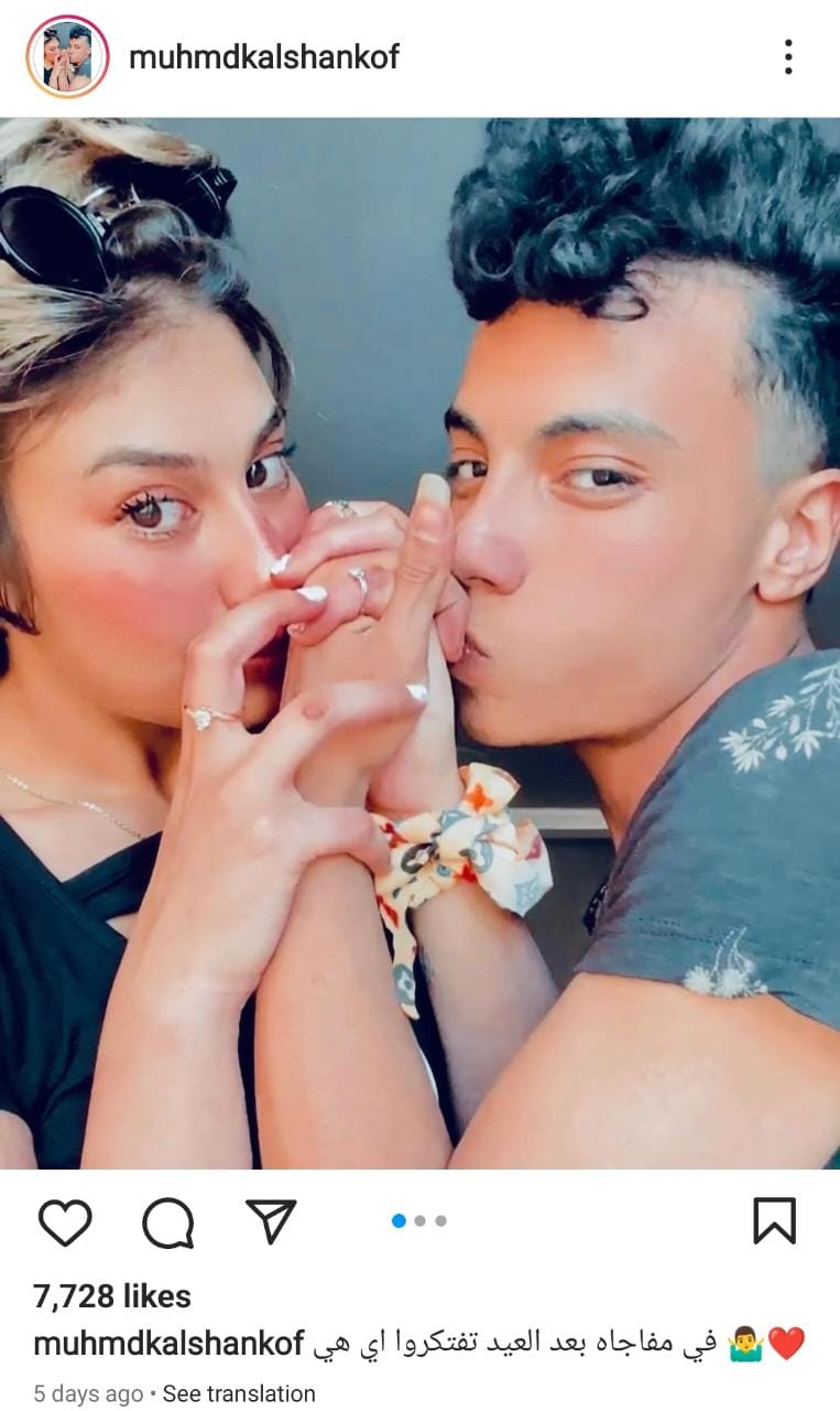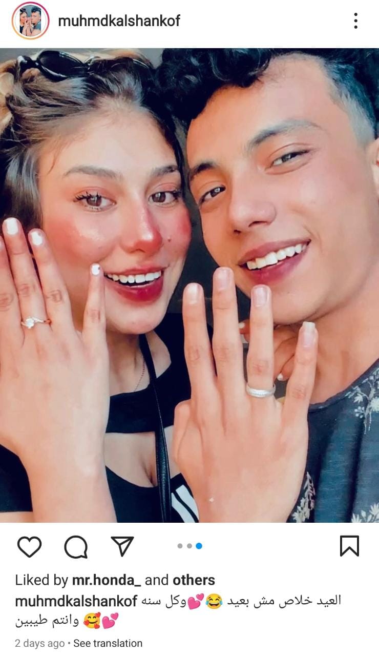 بالإضافة إلى نشره فيديو آخر لهما، على أنغام أغنية اتفضل جوه قلبي، للمطرب الشعبي عبد الباسط حمودة، وكتب: اتفضل جوه قلبي، مشيرًا إلى دبلة الخطوبة، الأمر الذي فسره متابعينهم أنهما في علاقة عاطفية، ومن المتوقع إعلان خطبتهما بعد العيد.