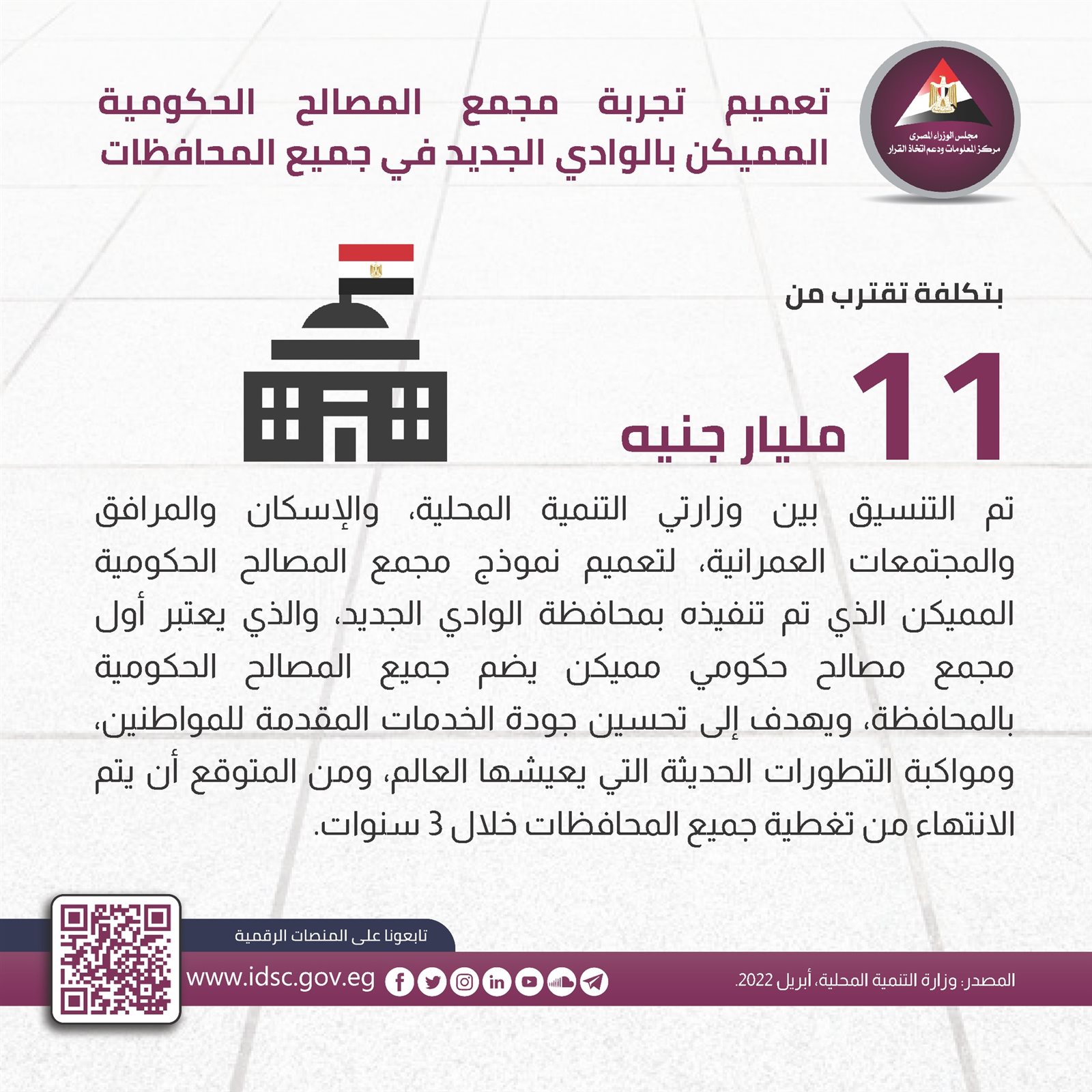 نشر مركز المعلومات ودعم أتخاذ القرار التابع لمجلس الوزراء، إنفوجراف؛ سلط خلاله الضوء على إقامة مجمعات حكومية مُجهزة بكل الوسائل التكنولوجية الحديثة في جميع المحافظات، لتيسير الخدمات الحكومية على المواطنين بشكل أسرع، بالتنسيق بين وزارتي التنمية المحلية، والإسكان والمرافق والمجتمعات العمرانية.