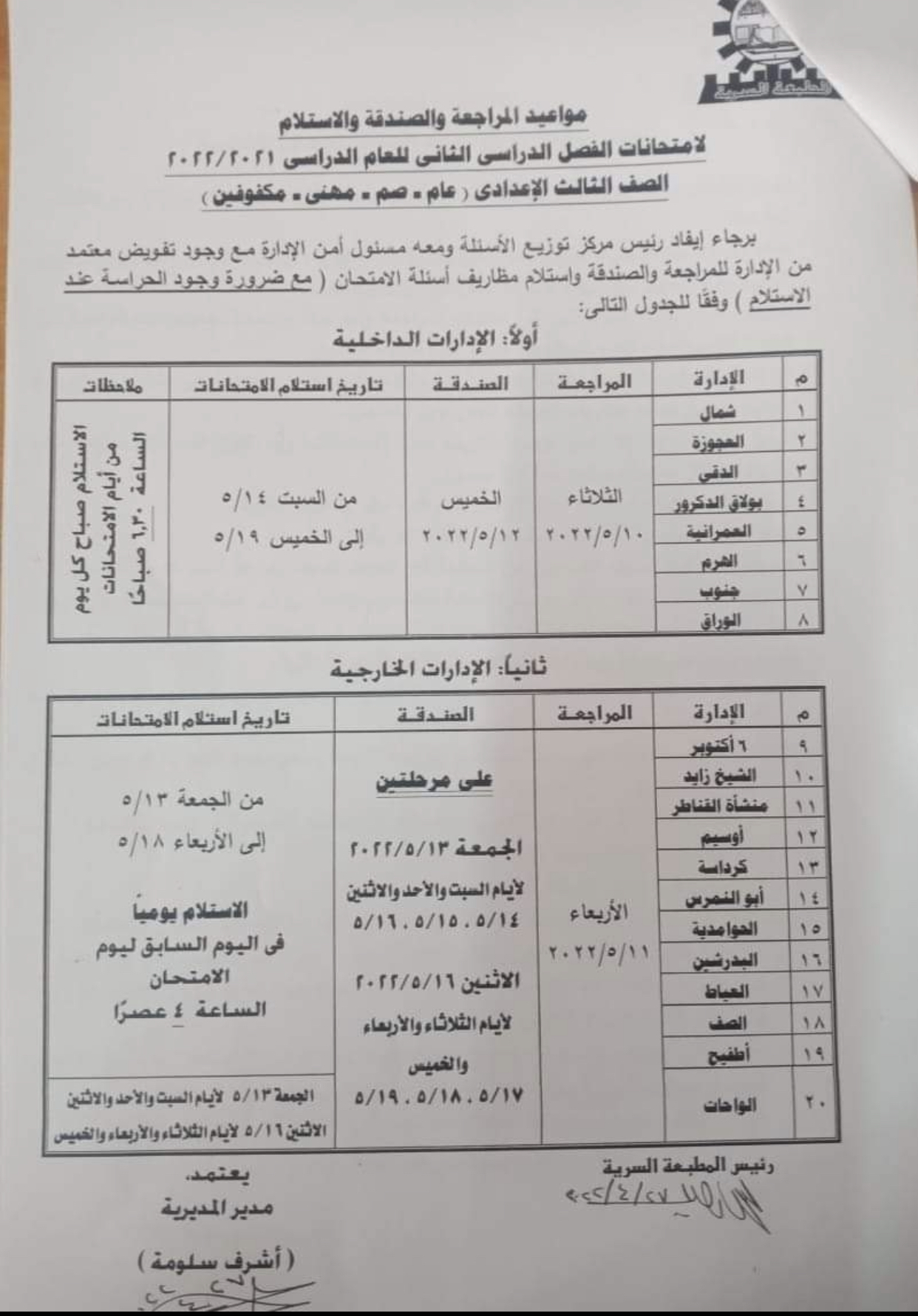 وجه أشرف سلومة، مدير التربية والتعليم بمحافظة الجيزة، خطابا للمديريات التعليمية؛ بشأن مواعيد توزيع أسئلة امتحانات الشهادة الإعدادية بالإدارات التعليمية بالمحافظة.