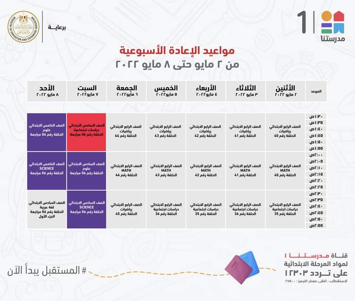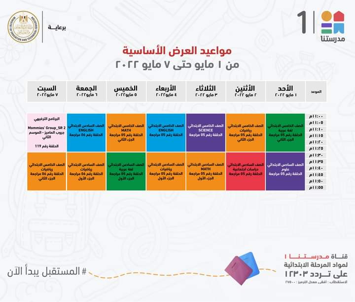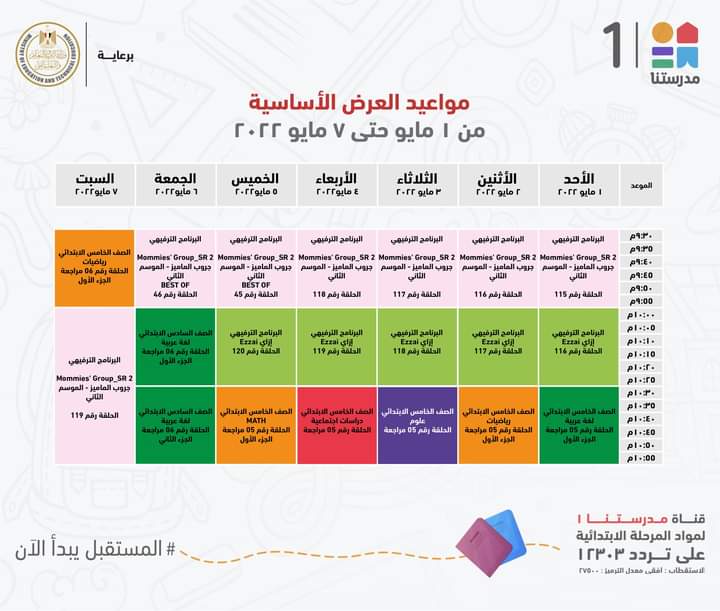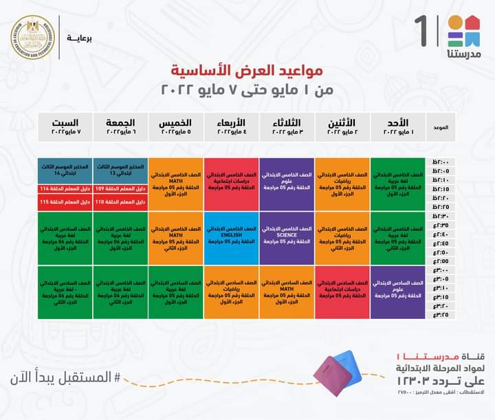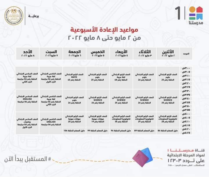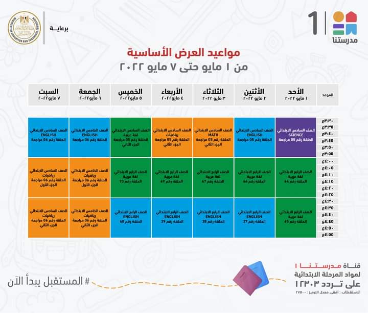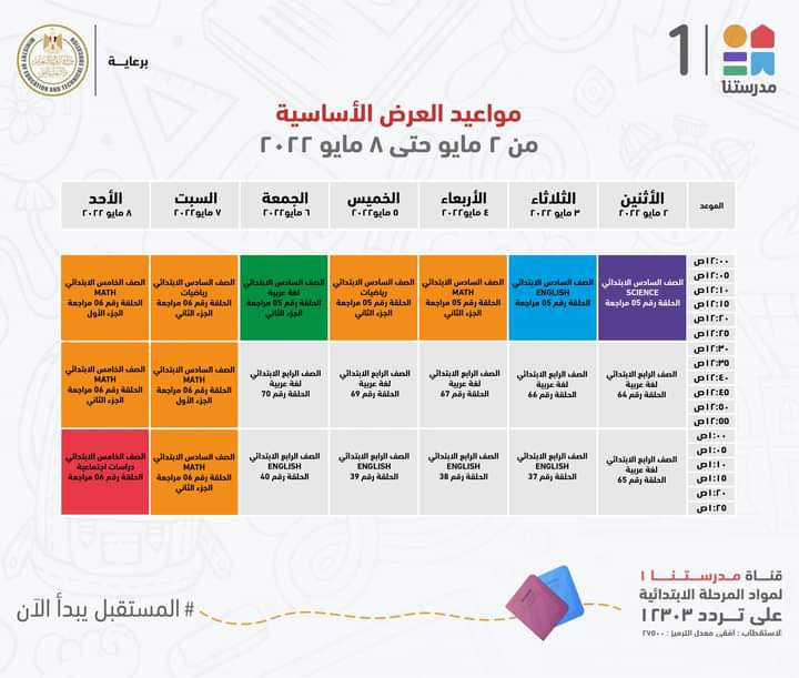 أعلنت وزارة التربية والتعليم والتعليم الفني، جداول مواعيد عرض البرامج التعليمية لجميع طلاب المرحلة الابتدائية مع الإعادة، والمقرر بثها على قناة مدرستنا 1.