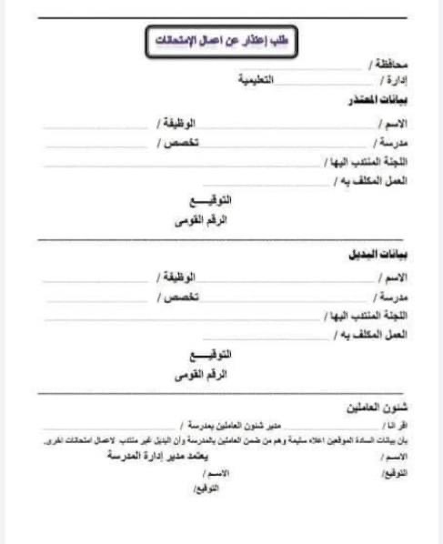 ننشر نموذج طلب الاعتذار عن أعمال الامتحانات للمعلمين بالمراحل التعليمية