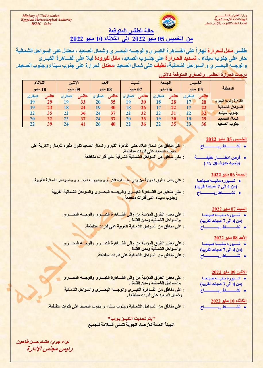 كشفت هيئة الأرصاد عن تفاصيل حالة الطقس المتوقعة في مصر خلال الفترة من اليوم الخميس وحتى يوم الثلاثاء المقبل الموافق 10 مايو الجاري لعام 2022.