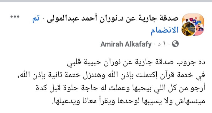 جروب صدقة جارية وختم القرآن على روح المعيدة نوران عبدالمولى
