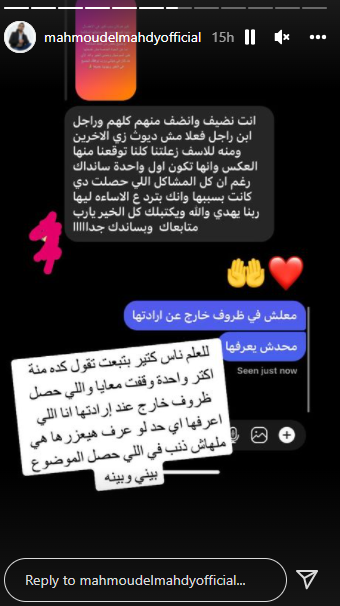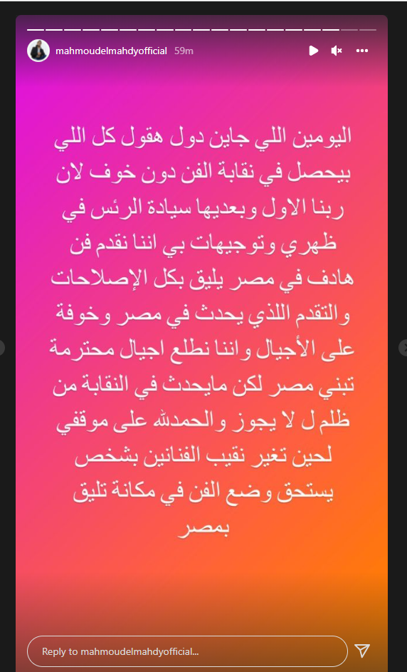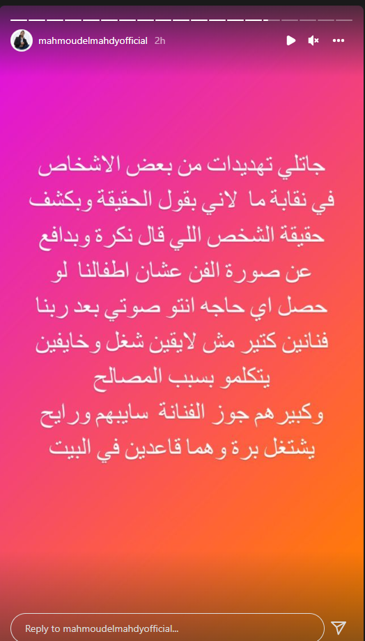 وكتب محمود المهدي، عبر خاصية ستوري حسابه الشخصي على انستجرام: جاتلي تهديدات من بعض الأشخاص في نقابة ما؛ لأني بقول الحقيقة، وبكشف حقيقة الشخص اللي قال نكرة، وبدافع عن صورة الفن؛ عشان أطفالنا.