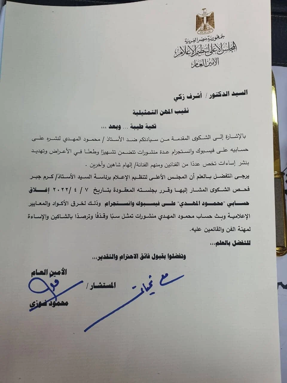 قرر المجلس الأعلى للتنظيم والإعلام برئاسة كرم جبر، إغلاق حسابي محمـود المهدي على فيسبوك وانستجرام؛ وذلك لخرق الأكواد والمعايير الإعلامية وبثه منشورات تمثل سـبًا وقذفًا وترصدًا بالشاكين والإساءة لمهنة الفن والقائمين عليها.